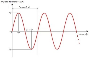 Una grandezza sinusoidale è definita da tre parametri fondamentali: ampiezza, frequenza e fase. L’ampiezza aumenta con continuità dal valore zero a quello massimo (Vp) per poi tornare a zero; diminuire fino al valore minimo (-Vp); ricrescere fino a zero e riprendere indefinitamente il ciclo dopo il periodo T.