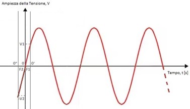 Se l’ampiezza della sinusoide in 0 è pari a zero, la sinusoide ha fase zero secondi; se, invece, essa assume in 0’ il valore V1 la fase della sinusoide (F1 nel grafico 2) è rappresentata dall’intervallo [0;0’]; se, infine, essa assume in 0’’ il valore -V2, la fase della sinusoide (F2 nel grafico sotto) è rappresentata dall’intervallo temporale [0’’;0]. Nel primo caso si parla di sinusoide in anticipo di fase, nel secondo caso di sinusoide in ritardo di fase.